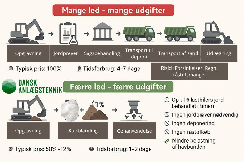 Kalkstabilisering skærer mange led ud af værdikæden. Våd jord behøver ikke køres bort, men blandes med ofte under én procent kalk og kan derefter genbruges som stabilt underlag. Dansk Anlægsteknik har længst erfaring på markedet og patent på deres teknologi, som kan håndtere alt fra fremmedlegemer og store klumper til høj fugtighed.