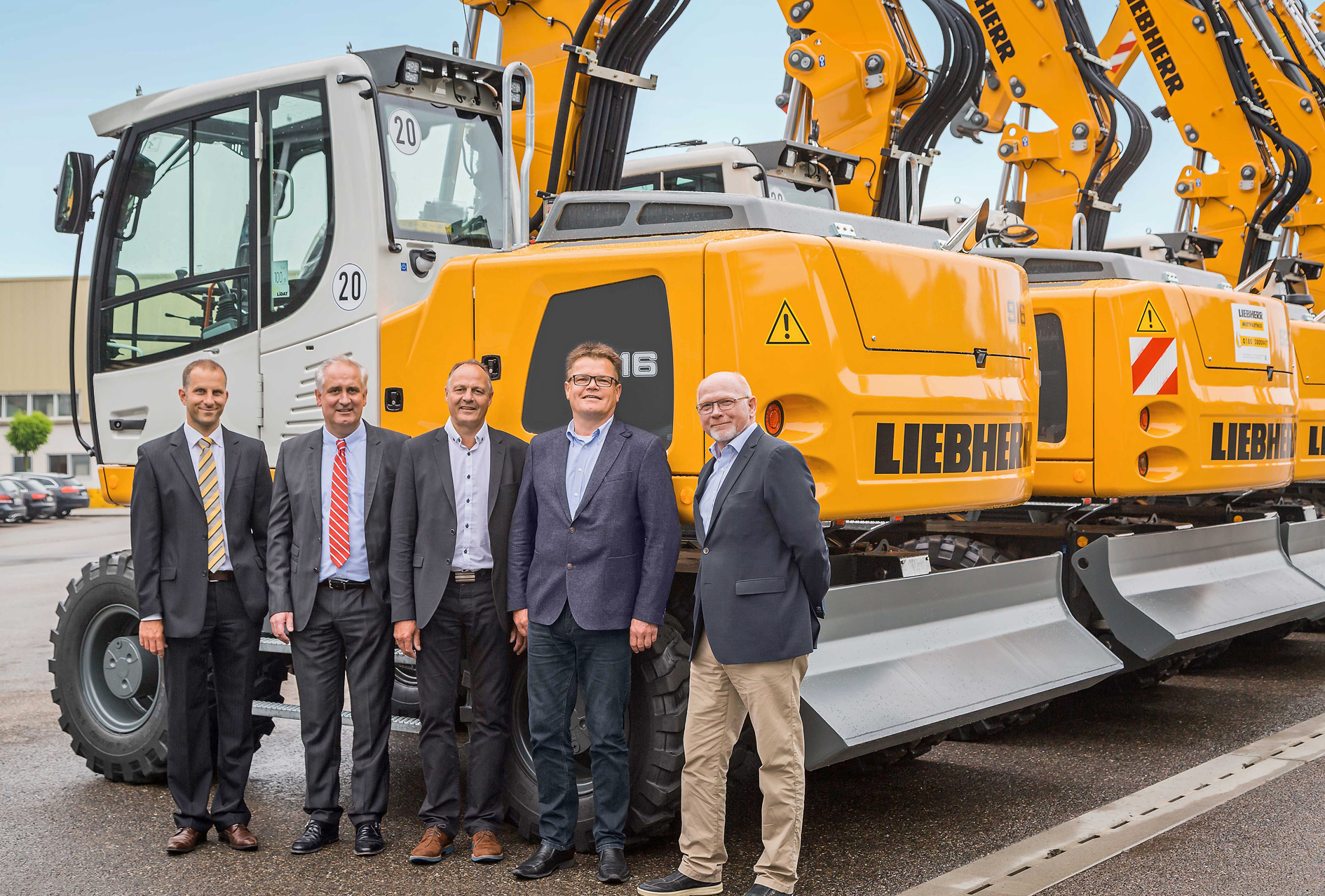 Karsten Klöcker og Rudolf Arnold fra Liebherr tager imod cheferne fra den danske importør. I midten direktør Leif Rudebeck Petersen, CEO Jan K. Møller og bestyrelsesformand Hans Holm, som i mange år var administrerende direktør for JMM-Group.