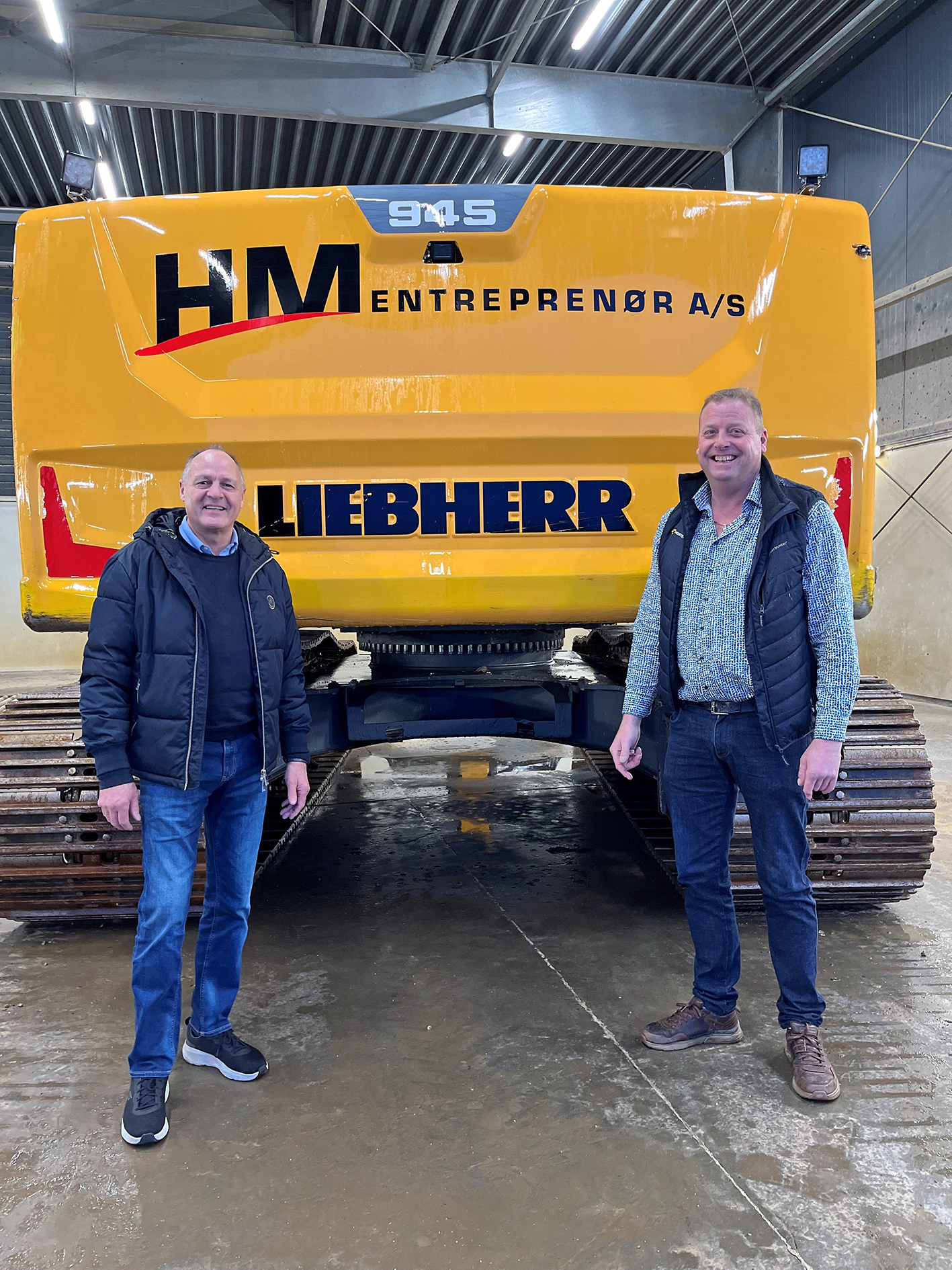 Entreprenør Michael Mortensen, HM Entreprenør A/S, har stadig rekorden i antal store Liebherr i én handel. Horsens-entreprenøren købte 57 maskiner i 2023. Her til højre i selskab med direktør Leif Rudebeck Petersen, Johs. Møllers Maskiner A/S.