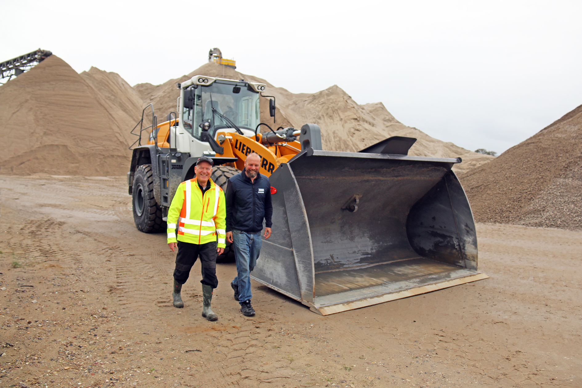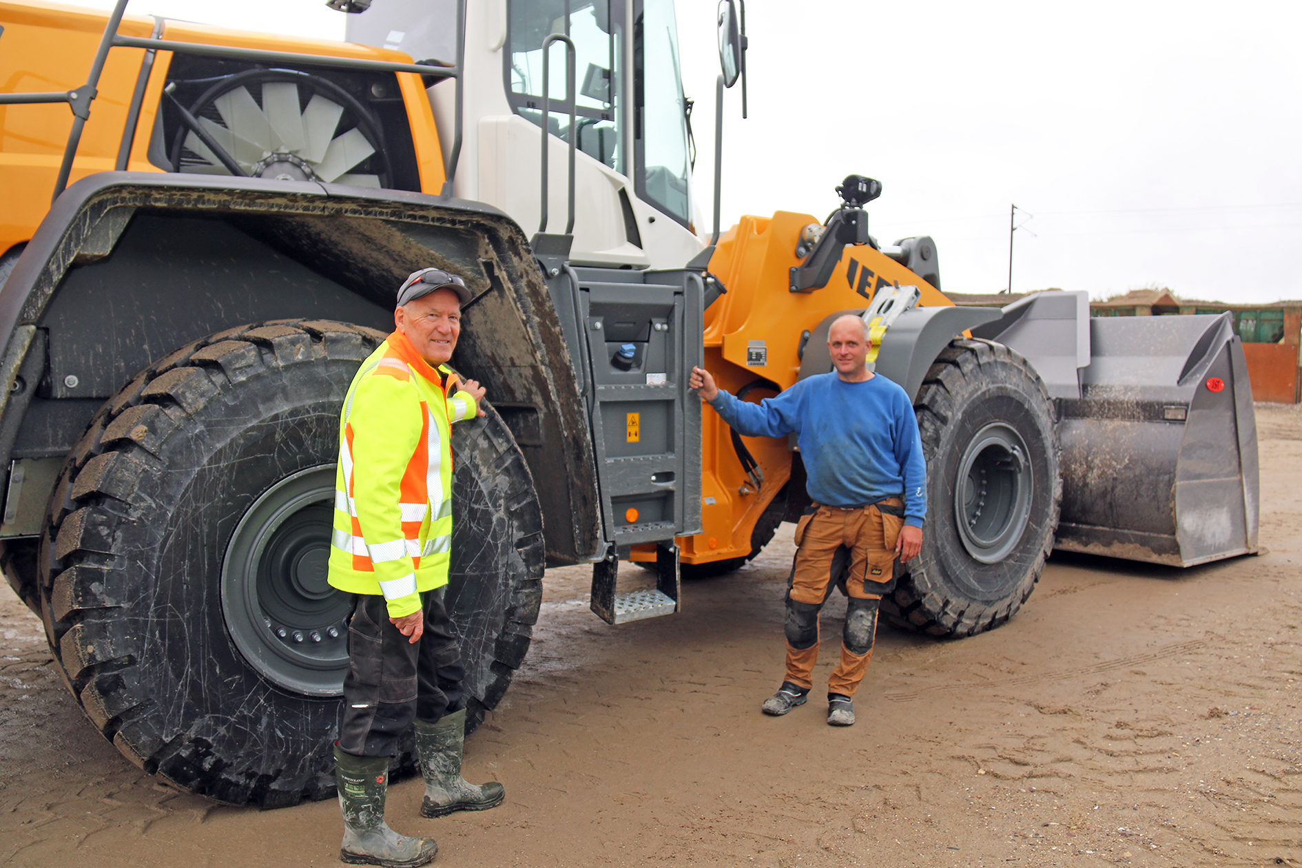 John Müller (til venstre) får en snak med maskinfører Palle Vehl ved Liebherr-gummihjulslæsseren.
