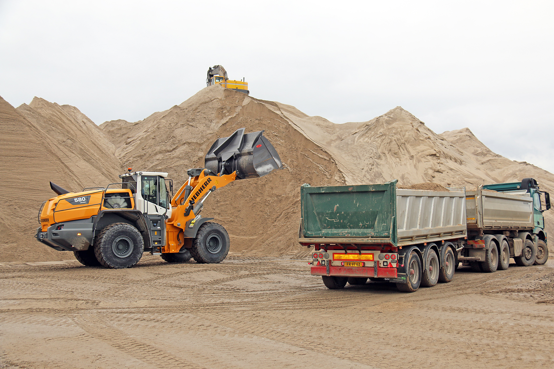 Det er Liebherr-læsseren, der tager den store tørn, når der skal flyttes materialer rundt i Kliplev Grusgrav og læsses på bilerne, der ruller hen over brovægten i en stadig strøm.