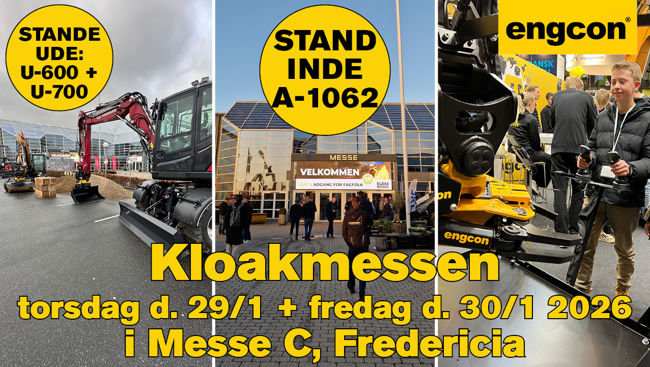 engcon ses både inde (STAND A-1062) og ude (STAND U-700 + U-600) på Kloakmessen 2026 i Messe C, Fredericia.