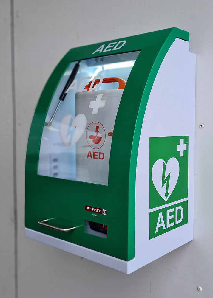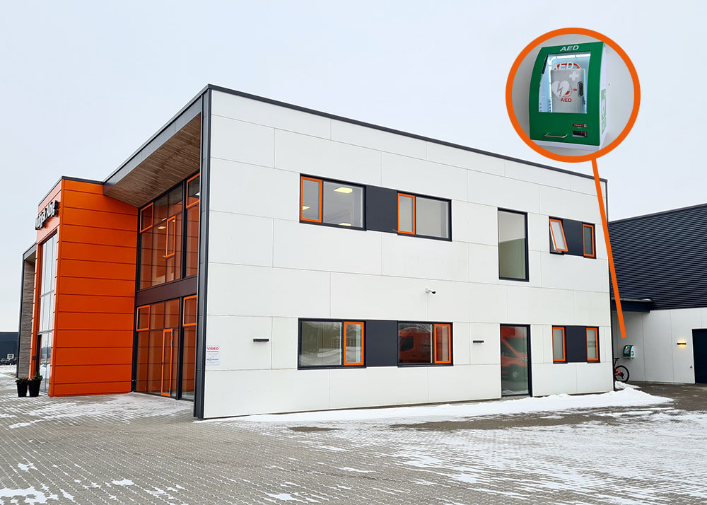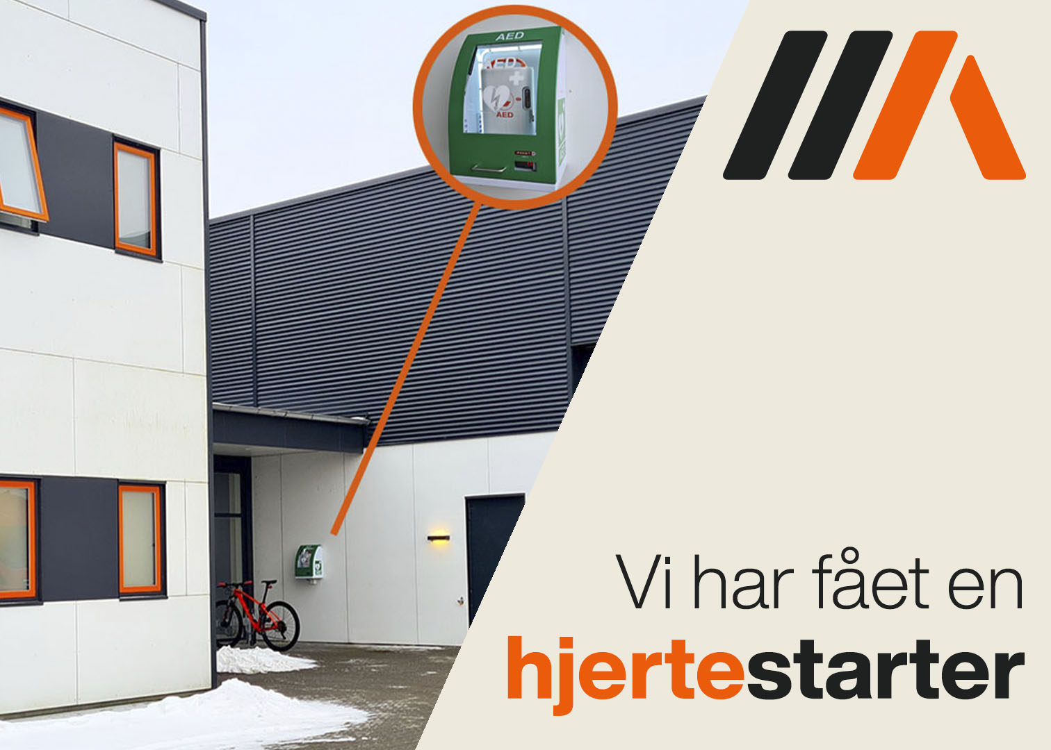 Vi tager arbejdsmiljø og sikkerhed seriøst og ser det som en naturlig del af vores ansvar som arbejdsplads. Derfor har vi investeret i en hjertestarter, som hænger udenfor og er frit tilgængelig for alle – døgnet rundt. Se placering på billederne.